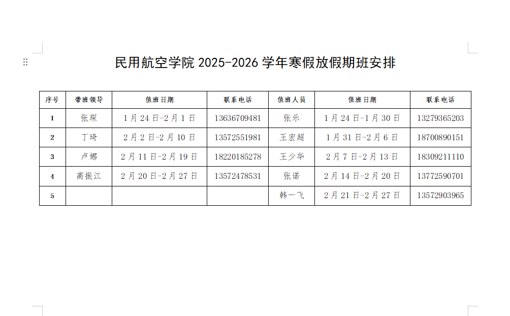 民用航空学院2025-2026学年寒假放假期班安排